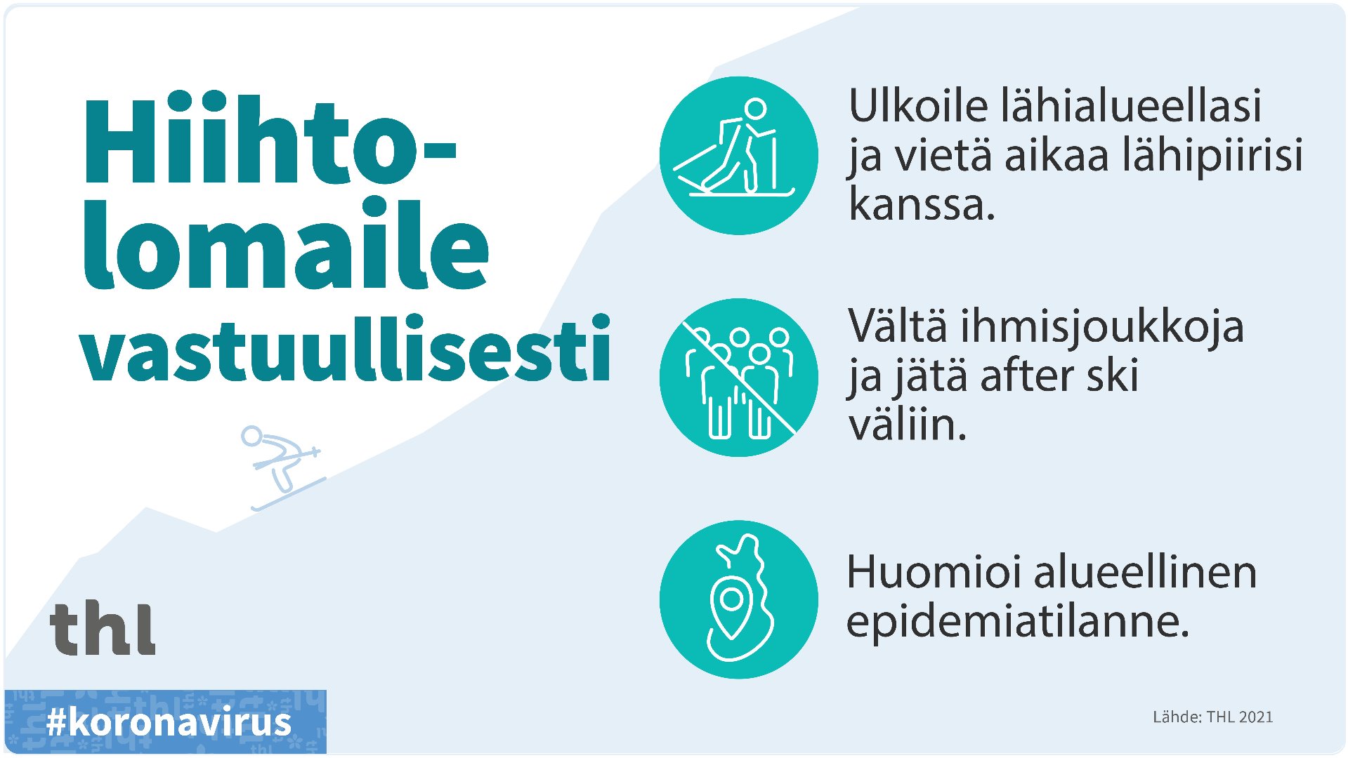 Sekä arjessa että tulevalla hiihtolomaviikolla tulee muistaa tutuiksi tulleet, hyvät terveysturvalliset käytänteet, kuten turvavälit, väkijoukkojen välttäminen, maskien käyttäminen ja hyvä käsihygienia.