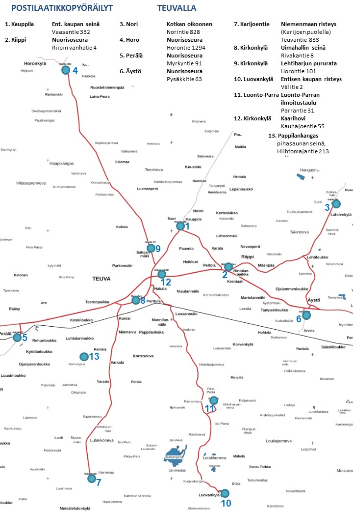 Postilaatikkopyöräilyssä on 14 postilaatikkopistettä eri puolilla Teuvaa. Kirjaa postilaatikossa olevaan vihkoon päiväys ja nimesi. Kirjaa nimesi perään ruksi, jos käytät pyöräilykypärää.