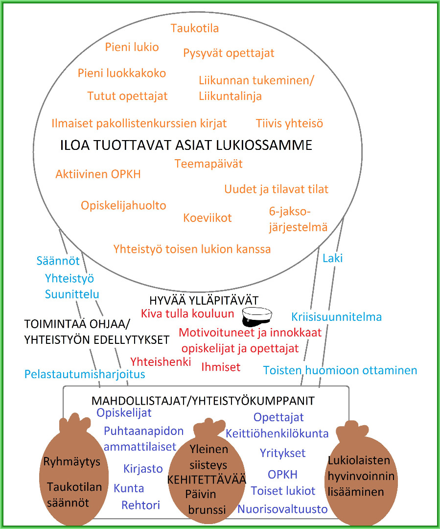 Jokaiselta luokkatasolta kutsutaan mukaan 1-2 edustajaa, lisäksi opiskelijakunnan hallituksesta 1-2 edustajaa. Samat edustajat ovat mukana koko vuoden. Lisäksi kokouksiin osallistuvat rehtori, opo, terveydenhoitaja, kuraattori ja psykologi (mahdollisuuksien mukaan). Muita osallistujia kutsutaan esille nousevien aiheiden/tarpeiden mukaan, esim. etsivän nuorisotyön edustaja, huoltajia ym. Kokousten asialistat ja muistiot ovat kaikkien luettavissa lukion nettisivuilla.
